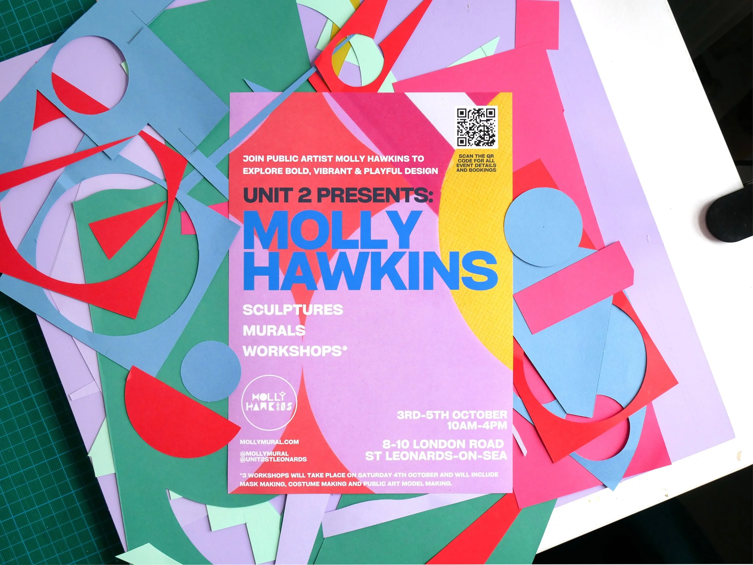 From crafting colourful murals and sculptures to interactive workshops, this exhibition invites visitors of all ages to explore, play and make art together. Whether tearing coloured paper to create collages, trying on handmade costumes, or crafting sculptures of imaginative worlds, Molly invites all to embrace playfulness and experimentation, proving that art doesn’t need to be serious to be meaningful.