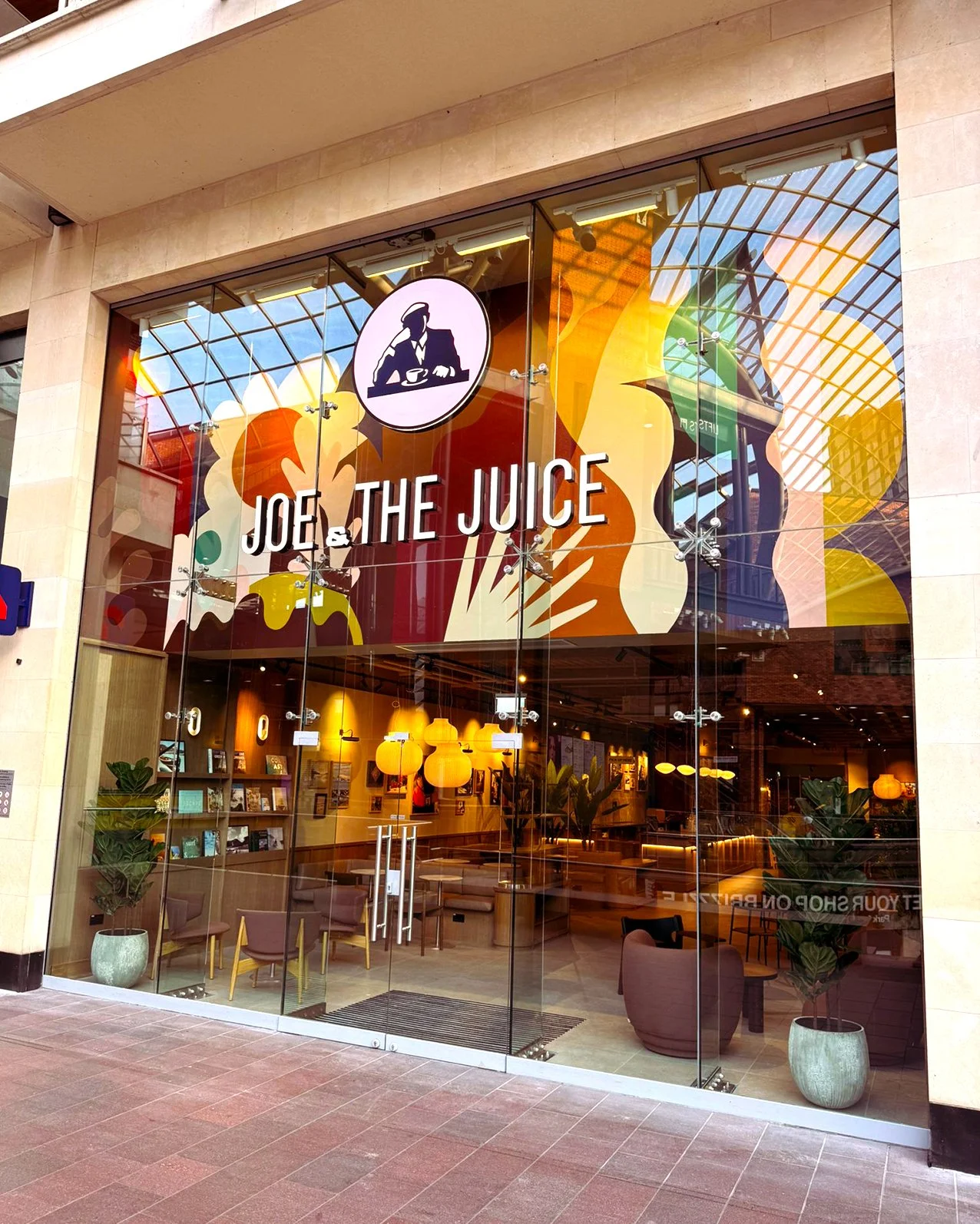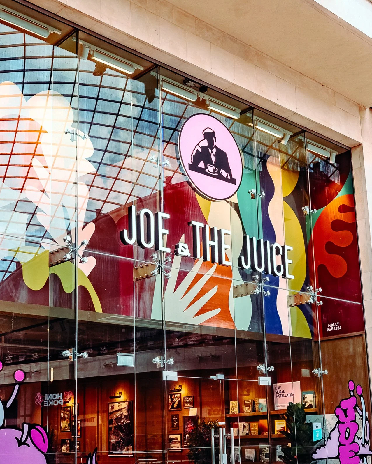 Molly Hawkins collaborated with Joe & the Juice to create an iconic mural for their Bristol branch. Possibly the first mural to take over a storefront in Cabot Circus, the artwork celebrates all things Bristol in a deliciously abstract way.